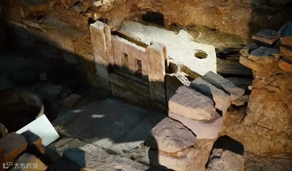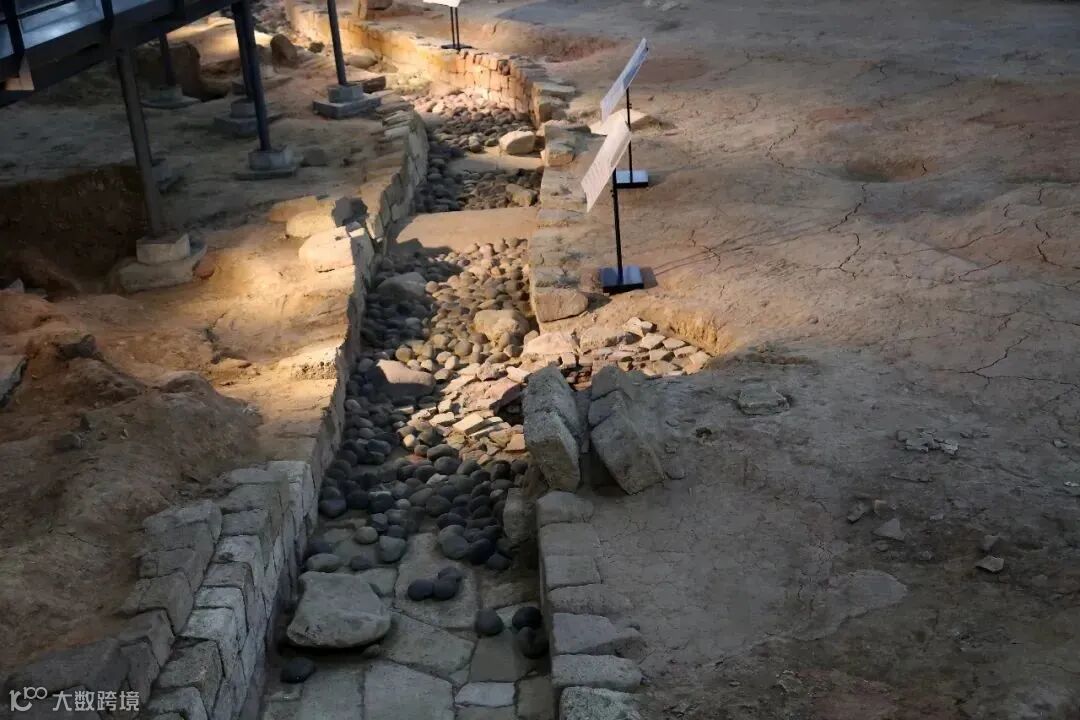 1997年,在石构水池的南面,考古人员发掘出超160米长的石渠。石渠由红砂岩石砌筑,截面净高0.7米,宽1.4米,底部铺满灰黑色卵石。石渠之水从北面石池底的暗槽流入,最终由西端的暗槽流出,来无影、去无踪,其中巧妙的构思和精心的设计,造出石渠各段不同流速、不同波形和不同声响的动态水景。
