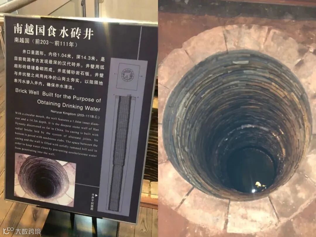 李时珍在《本草纲目》中称:“凡井水有远从地脉来者为上,有从近处江湖渗来者次之。”南越王宫中的水井现存深度最浅9米,最深达14.3米,创下中国秦汉考古发现深度之最。水井附近地表以下约20米即为基岩层,而井底距今地表深19.3米,可以推测出这口井当时凿深至基岩层表面,它穿过潜水层、不透水层,到达承压水层,受大气降水和地表水的影响极少,水源稳定、水质清洁卫生,是理想的饮用水源,渗涌上来的水十分清澈甘甜,能与今天的矿泉水相媲美。