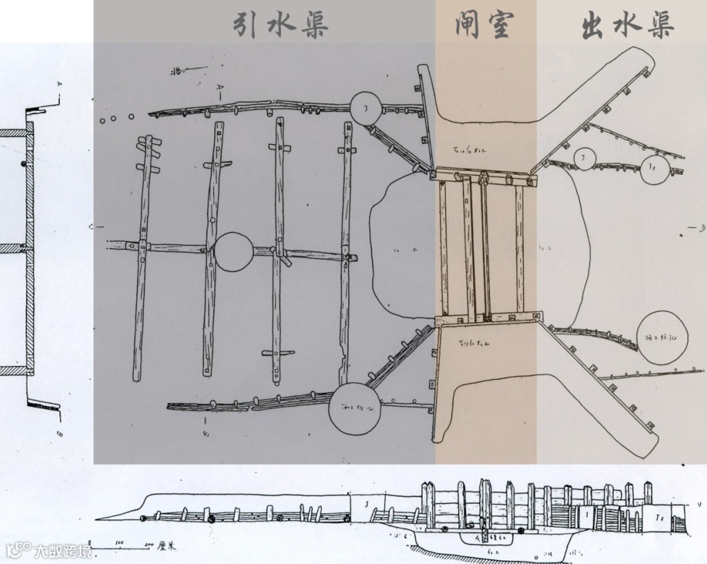 整个水闸采用木材搭建,构筑方法是先竖起一排方形木桩,用榫卯嵌入枕木,在木桩外侧横叠三块宽约60厘米的挡水木板,再填土夯实,保证闸室侧墙固定。水闸的闸门位于闸室中部,两侧方柱由上至下凿有凹槽,用于插板闸水,可启可闭,可装可拆,是当时十分成熟高超的水闸控制泄流技术。