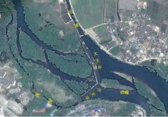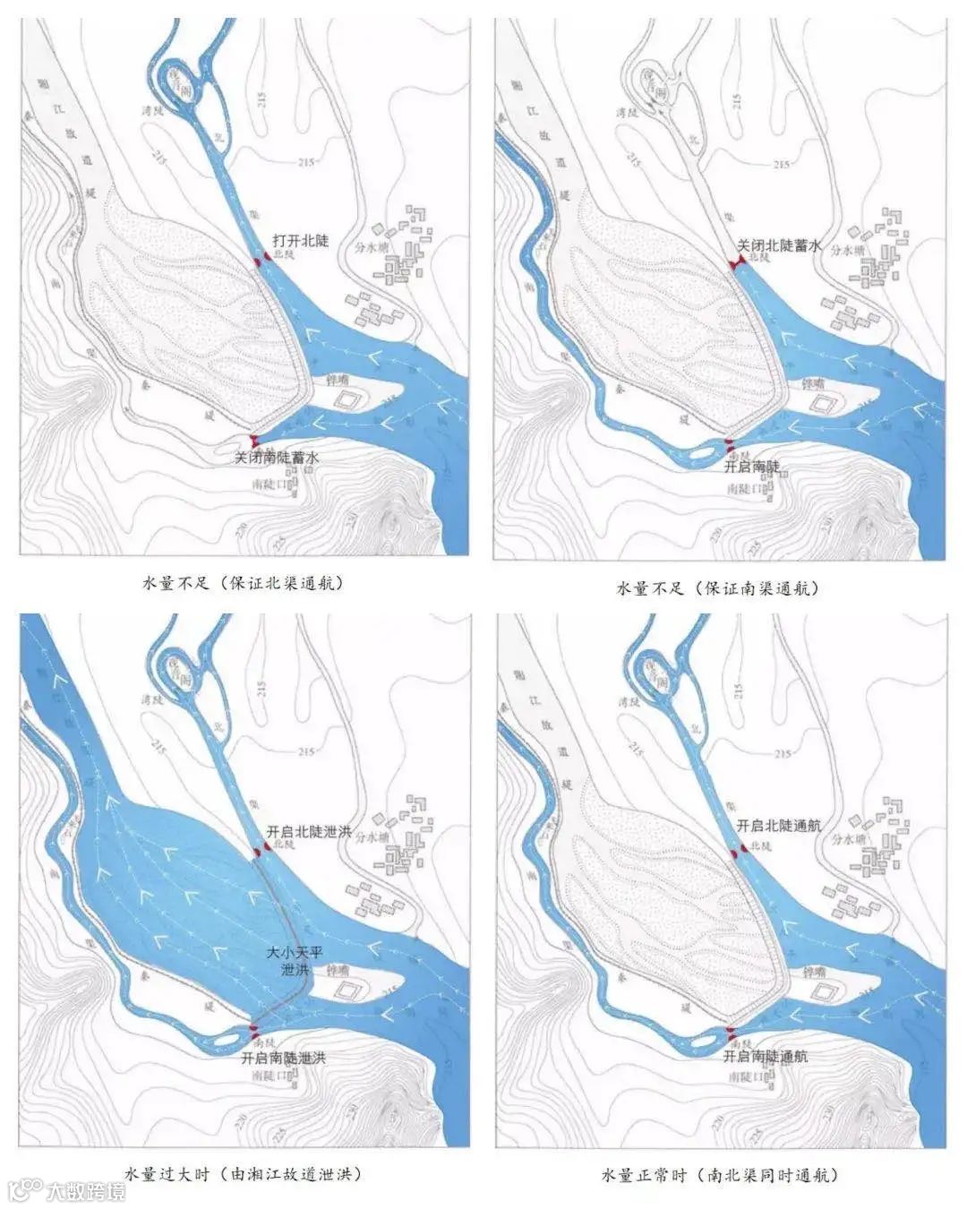 为了将湘江水导入灵渠,需建一道“前锐后钝”的分水堤。因其形似犁铧,故名“铧嘴”。“铧嘴”后接两条长堤:北堤稍长,称“大天平”;南堤稍短,称“小天平”。三者组建成人字形分水堤。“铧嘴”前端直指湘江上游,将水流一劈为二。三分南流,被“小天平”导入南渠;七分北流,被“大天平”导入北渠。南渠向西延伸汇入漓江,北渠向北延伸重回湘江。因此,灵渠包括南北两条水渠,各有分工,相辅相成。