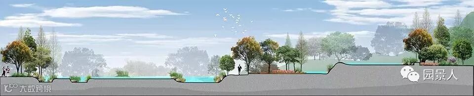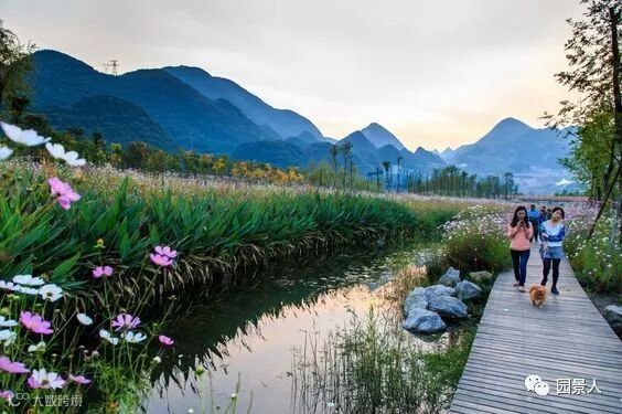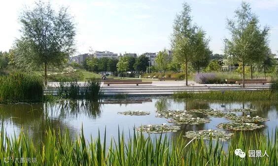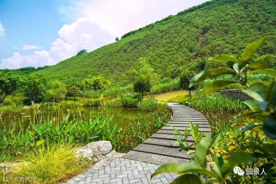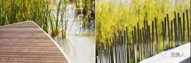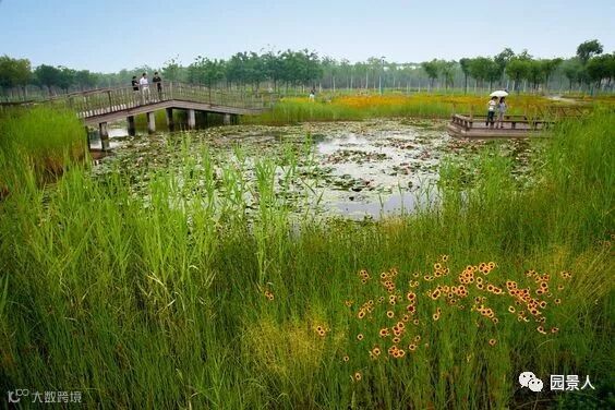 开阔的水面,水生植物放坡形成的生态驳岸,设计中将木栈道伸入水面上,很大程度上满足了人亲水性,因为湿地其本身的功能除了净化水资源外还在于让人们亲近的功能。在植物种植上,高低搭配,在木平台的地方多设计有各种水生植物,通过水生植物来转换人的视觉空间感受,营造一种,走出木平台就豁然开朗的视觉感受,同时让见惯了钢筋混凝土的小伙伴体验一下野趣的味道。