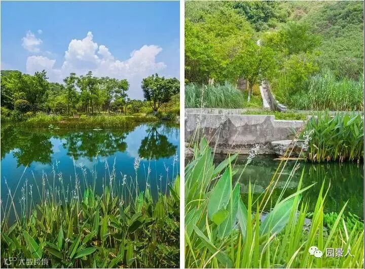 此区域水深0.9—2.5m,植物配置时主要考虑湿地净化污水作用和自净能力,常采用沉水植物+部分漂浮植物的配置方式,保证生态的同时,营造静谧、深邃的自然气氛。