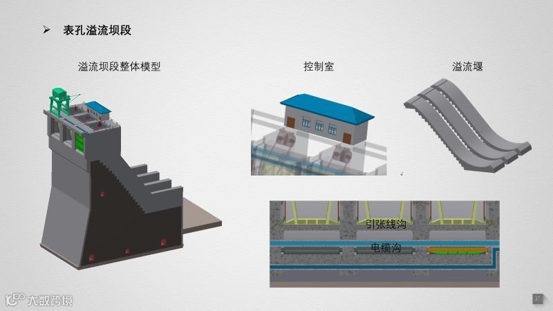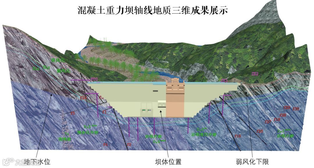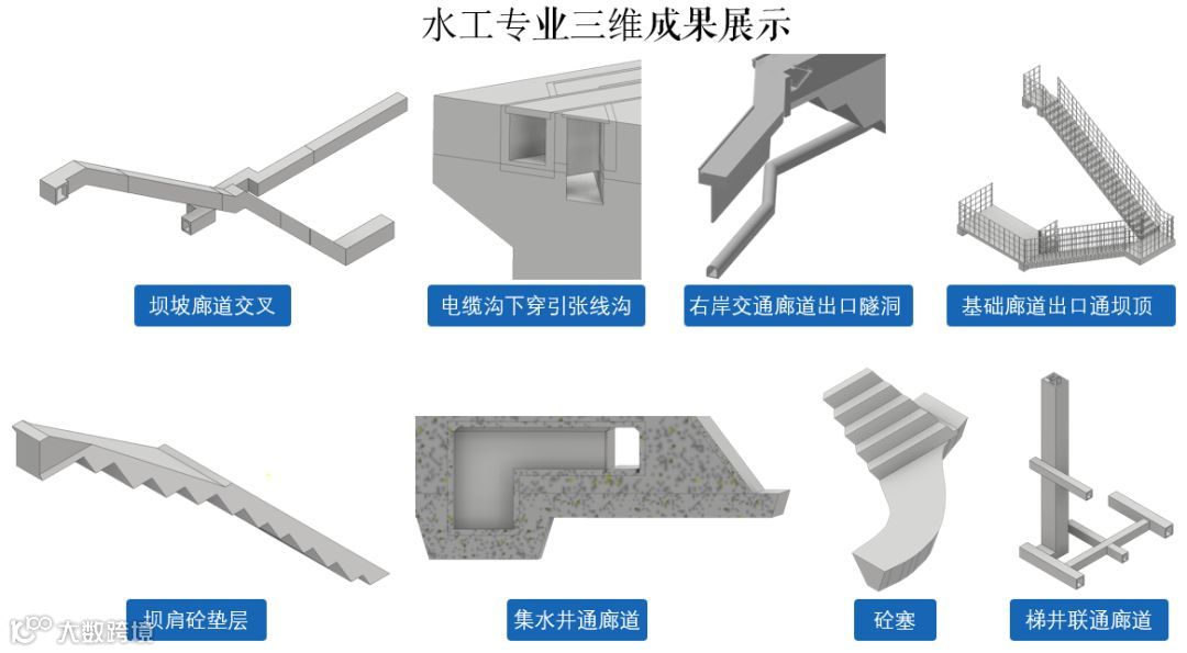 水工专业根据建筑物轴线,使用Civil 3D、 Inventor、 Revit对坝体、溢洪道、泄洪洞、引水系统、电站等建筑物进行结构模型创建,关联引用地质专业三维模型,水工结构设计同步进行建筑物开挖设计。