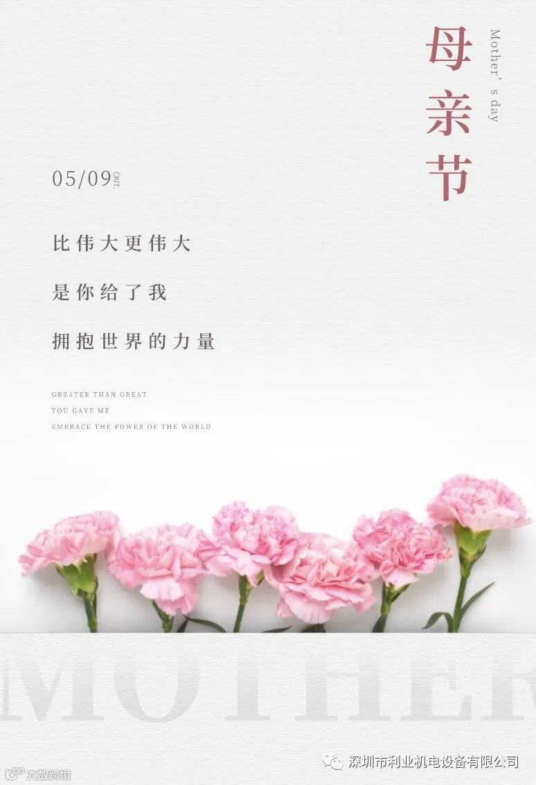 五月的风,温馨而婉约,空气中荡漾着草的清香,花的芬芳,阳光欢快的在指尖跳跃,在这个舒心惬意的季节,迎来了一个伟大的节日——母亲节。以爱之名,致敬母亲,深圳市利业机电设备有限公司祝全天下母亲节日快乐!