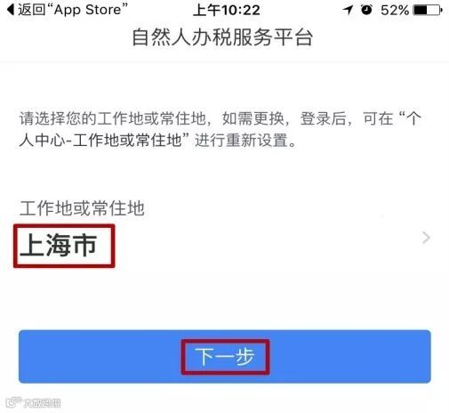 第三步:下载后,打开APP,在工作地或常住地下拉列表进行选择,点击“下一步”。