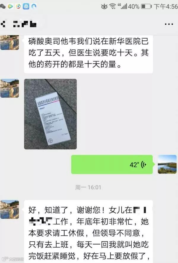 曾母在居家隔离治疗期间用微信向湖北省新华医院急诊科主任孙国兵咨询用药情况。