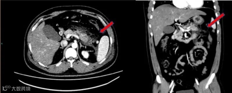 腹部增强CT提示胰腺尾部肿胀,胰腺周围脂肪间隙模糊,多发斑片状、条索影。红色箭头示胰腺脂肪间隙。