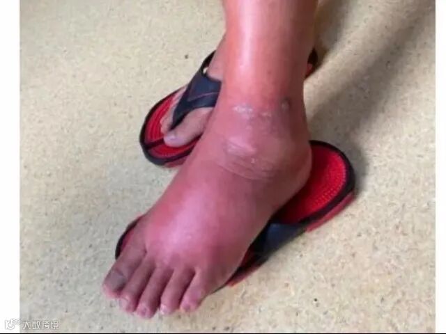 一坐下来,大叔就卷起裤脚,露出“触目惊心”的左脚,肿得像个红萝卜。
