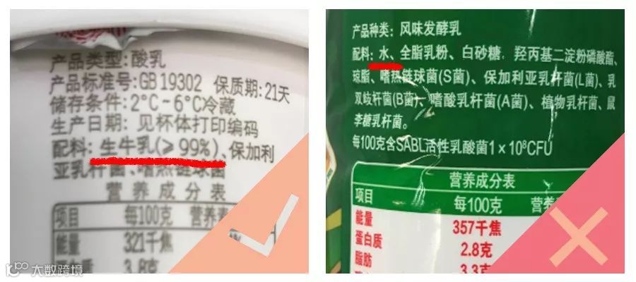 原料的含量是由高到低排列的,第一位是生牛乳证明它含量最多,如果你看到「水」在酸奶配料表的第一行,那么很有可能你是买到酸奶味的饮料了。