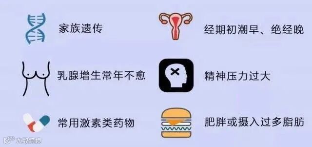 乳腺癌有很多诱因,比如乳腺癌家族史,家里有1~2位近亲属有乳腺癌,并且在年轻时发病,这样的女性需要定期检查;月经初潮的年纪小于12岁,大于55岁才到更年期的女性暴露在雌激素的环境时间较长,未婚、未育、晚育、未哺乳,服用外源性激素的女性及淋巴瘤患者曾经胸部接受过放疗的,患乳腺癌的风险较高;更年期后的肥胖也被文献报道为乳腺癌的高危因素之一。