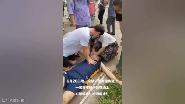 6月20日傍晚,北京定慧公园旁健步道上,一名青年男子跑步时突然倒在地上,心跳骤停。