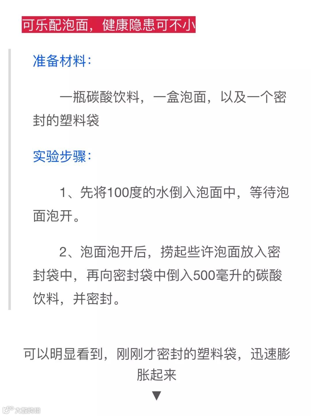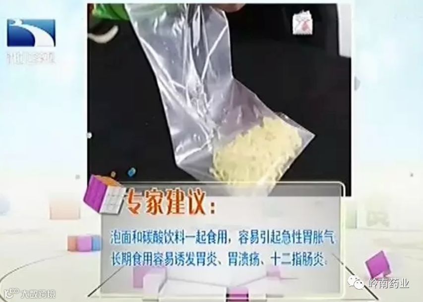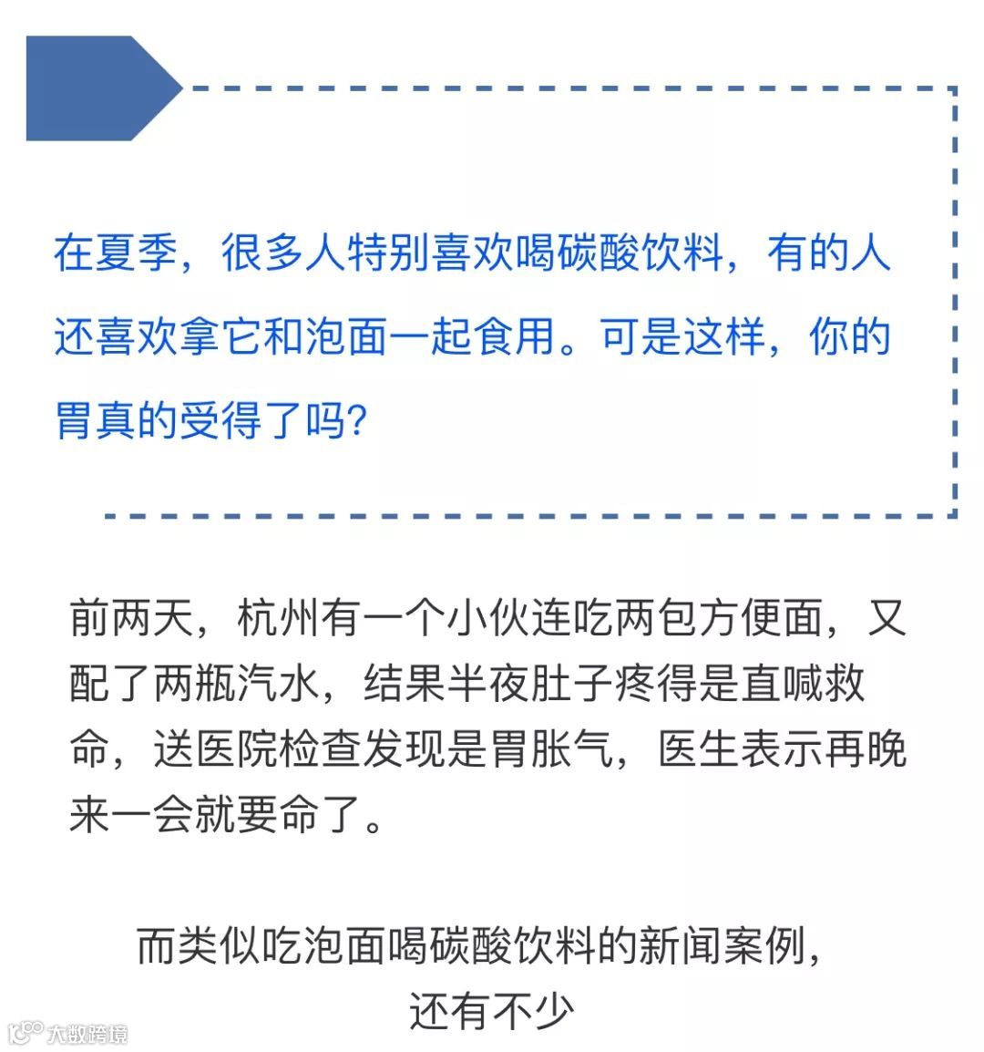 医院主任医师谭洁解释,泡面和碳酸饮料,建议尽量不要一起食用,因为泡面中,含有一定的食用胶,同时再饮入大量的碳酸饮料之后,碳酸饮料和食用胶相互作用,产生大量的气体,会出现急性胃胀气的情况。