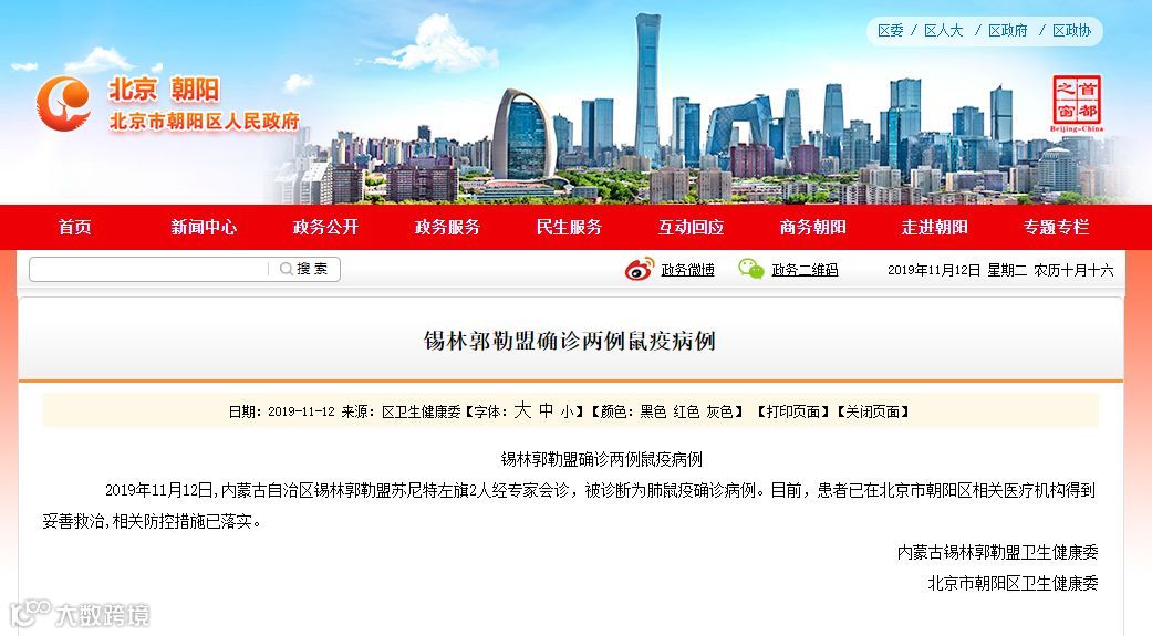 当天白天,有消息称,北京朝阳医院急诊科接诊两例患者,两名患者曾住进朝阳医院负压病房,其样本经中国疾控中心检测,11月12日中午确诊为肺鼠疫病例。根据有关部门的要求,所有开设发热门诊的医疗机构,重点筛查发热门诊就诊患者。