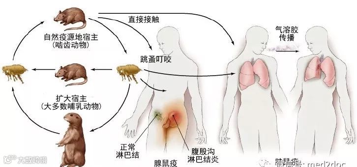(1)蚤叮咬的传播方式为鼠-蚤-人,即跳蚤叮咬病鼠后再叮咬人,或剥取染疫旱獭皮或剥食其它染疫动物,此类传播方式常引起腺鼠疫或败血型鼠疫。