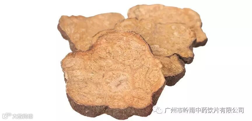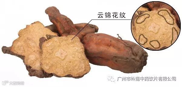 【主要鉴别点】 本品呈团块状或不规则纺锤形,表面红棕色或红褐色,皱缩不平,有浅沟,并有横长皮孔样突起和细根痕。体重,质坚实,不易折断。断面浅黄棕色或浅红棕色,显粉性,皮部有4~11个类圆形异型维管束环列,形成云锦状花纹,中央木部较大,有的呈木心。气微,味微苦而甘涩。