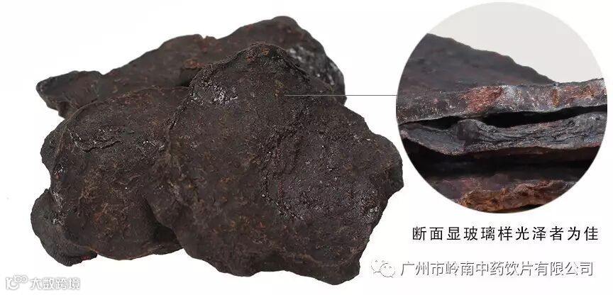 【主要鉴别点】本品呈不规则皱缩状的块片。表面黑褐色或棕褐色,凹凸不平。质坚硬,断面角质样,棕褐色或黑色。气微,味微甘而苦涩。