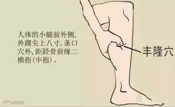 取穴:丰隆穴,小腿前外侧、外踝尖上8寸,距胫骨前缘二横指。