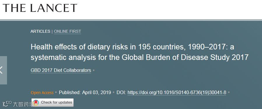 4月3日,《柳叶刀》发布了全球饮食领域的一项大规模研究——195个国家和地区饮食结构造成的死亡率和疾病负担。