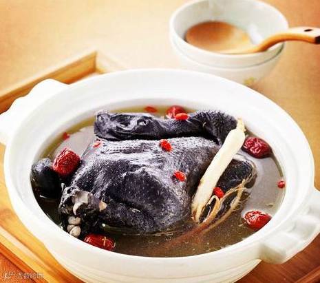 原料:乌鸡1只(约500克)、干淮山40克、枸杞20克、姜4片,酒少许、盐适量