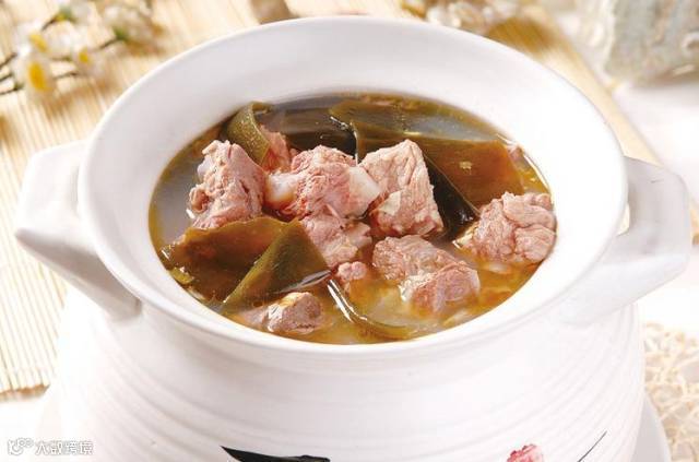 原料:猪排骨、海带结适量,姜片、精盐、黄酒少许