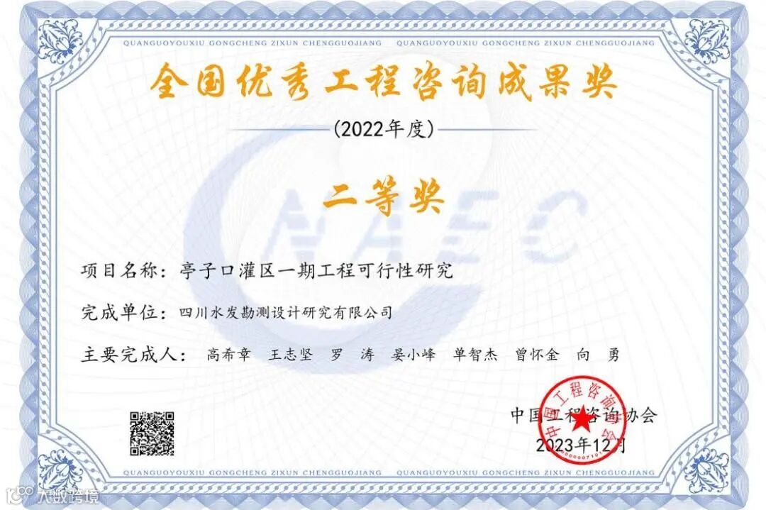 2023年12月29日,中国工程咨询协会发布《中国工程咨询协会关于公布2022年度全国优秀工程咨询成果奖获奖项目名单的通知》(中咨协政研(2023)112号)。其中,公司完成的《亭子口灌区一期可行性研究》荣获全国优秀工程咨询成果二等奖。