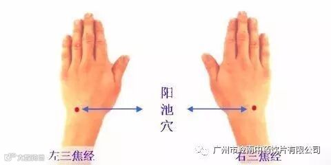 阳池这个名字就意味着囤聚太阳的热量。阳池穴在人的手背手腕上,位置正好在手背间骨的集合部位。寻找的方法是,先将手背往上翘,在手腕上会出现几道皱褶,在靠近手背那一侧的皱褶上按压,在中心处会找到一个压痛点,这个点就是阳池穴了。
