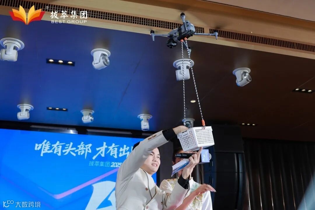 当晚的大奖——iPhone 17 由拔萃泰然“无人机医疗物流运输项目”的应用物流无人机送到获奖者手中,现场气氛热烈。