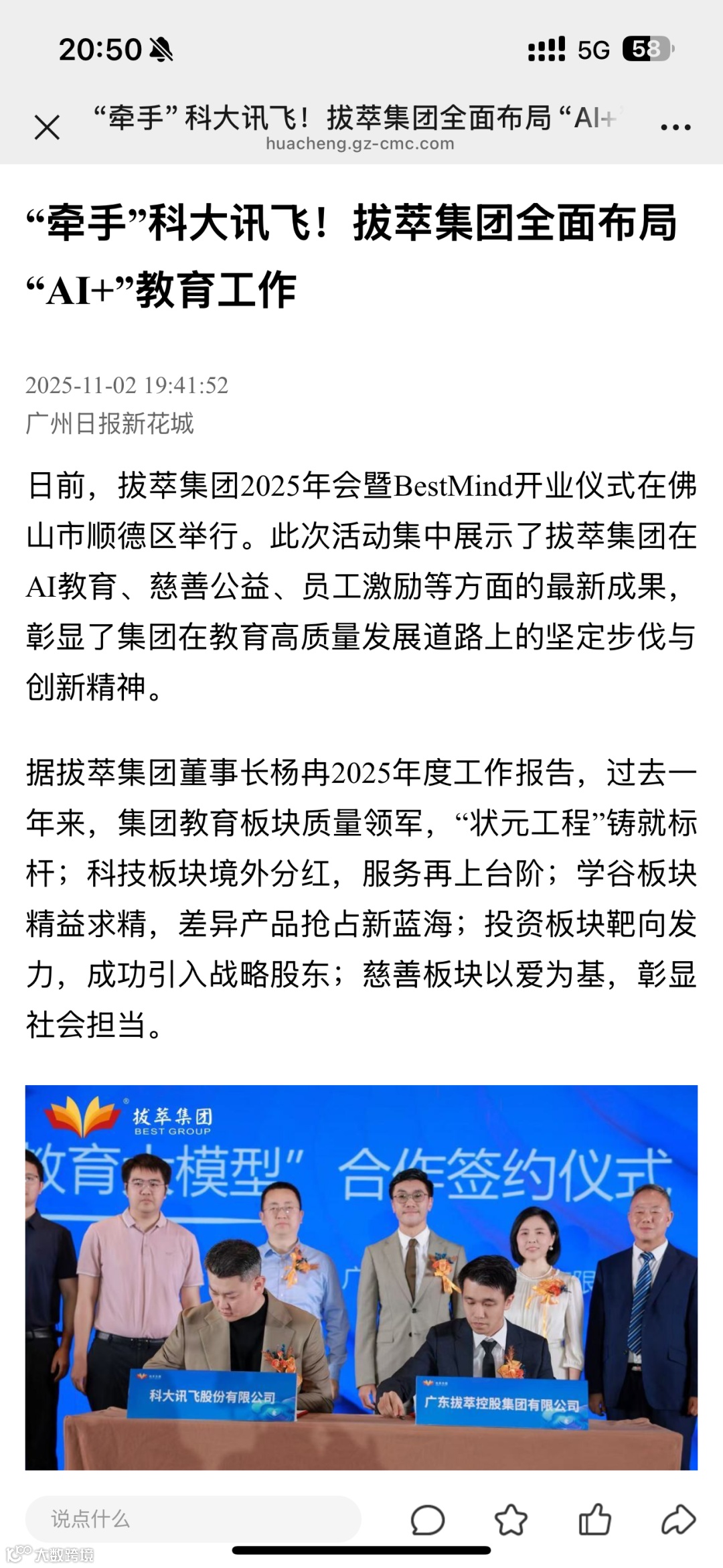 拔萃集团与科大讯飞代表共同签署"拔萃教育大模型"合作协议