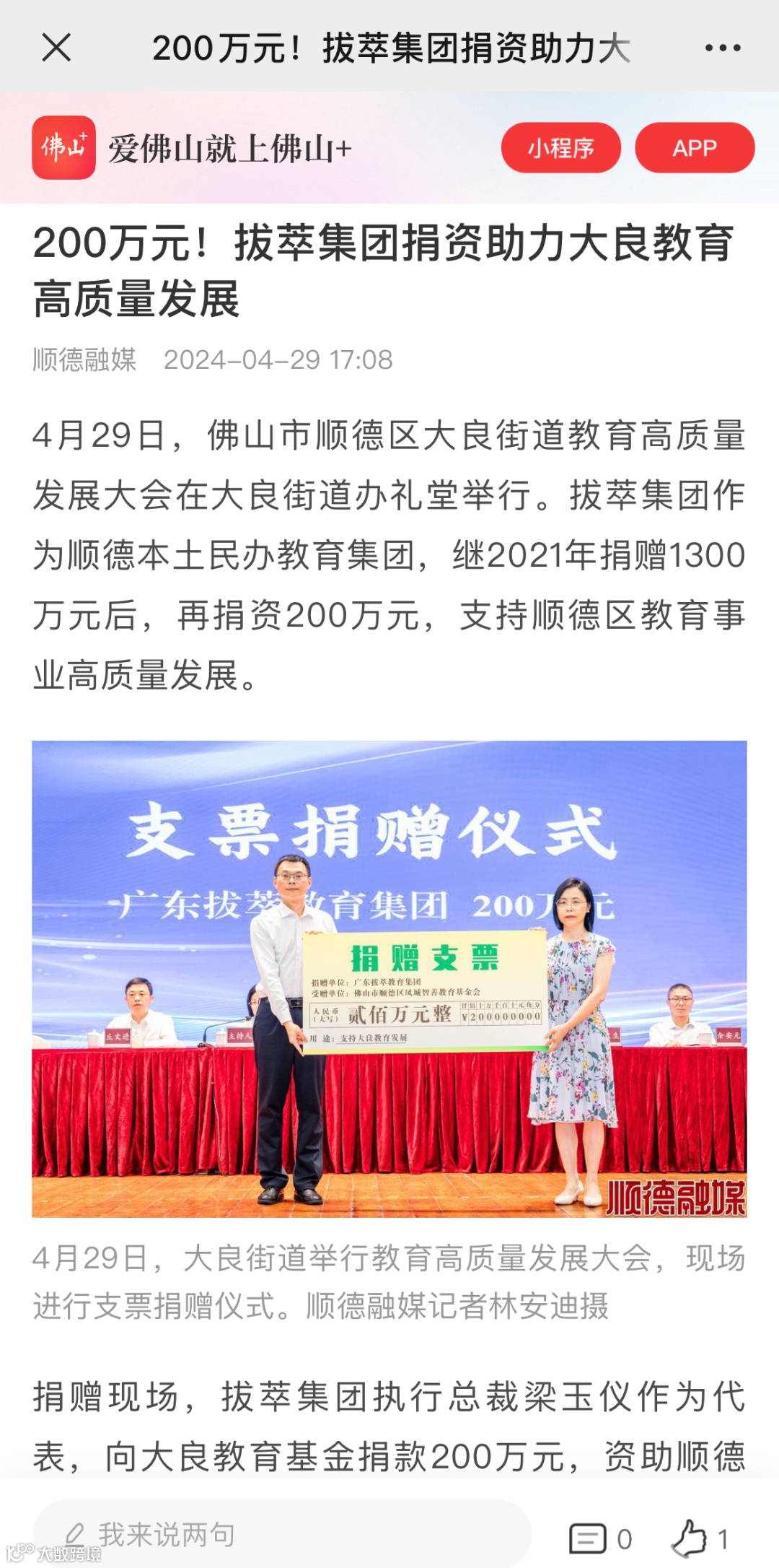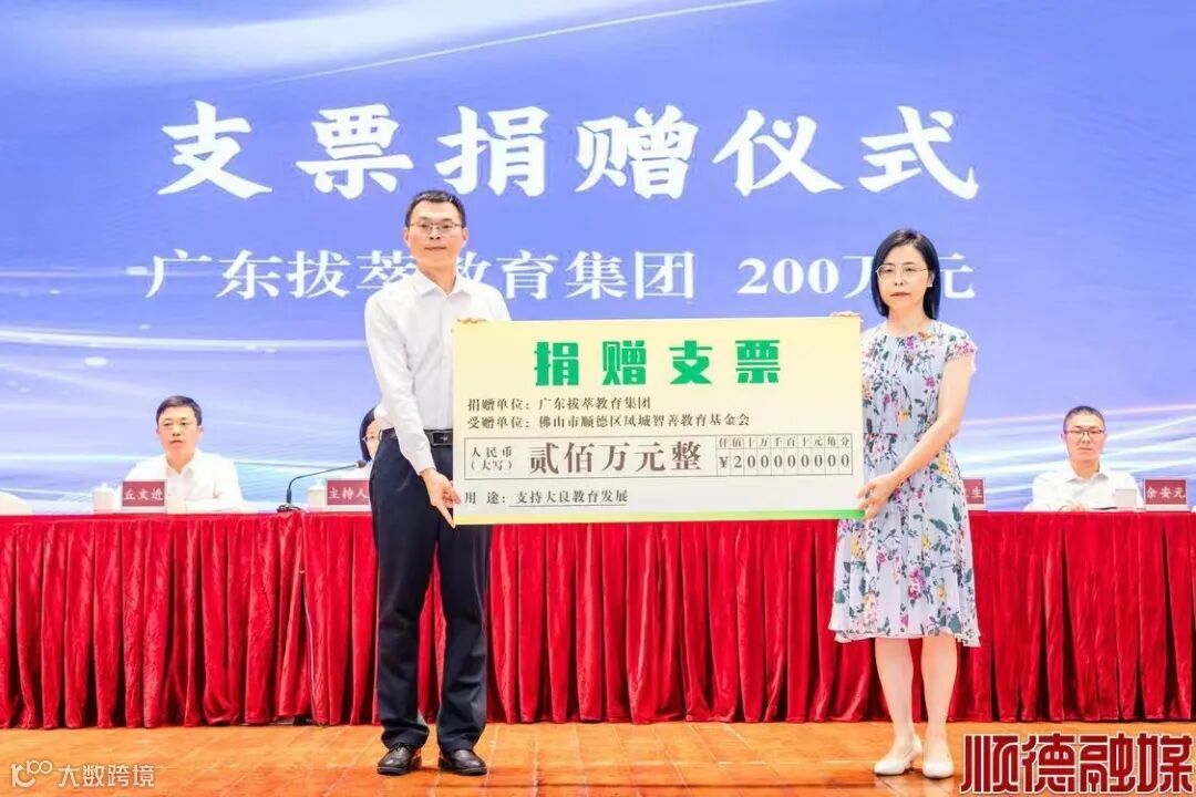 4月29日,佛山市顺德区大良街道教育高质量发展大会在大良街道办礼堂举行。拔萃集团作为顺德本土民办教育集团,继2021年捐赠1300万元后,再捐资200万元,支持顺德区教育事业高质量发展。
