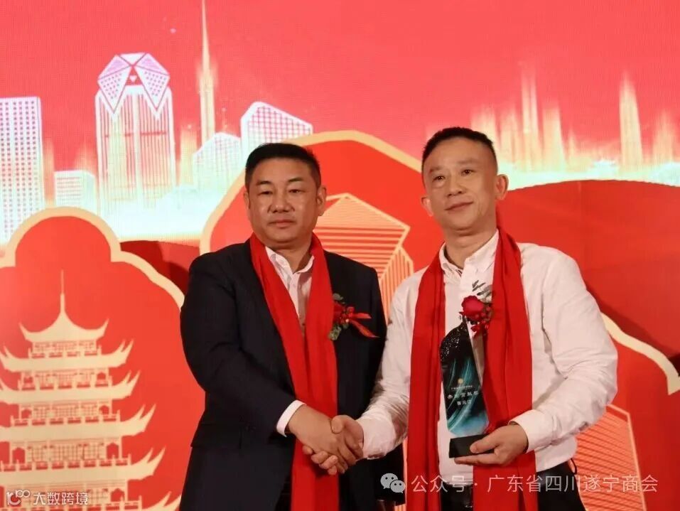 年会上还举行了隆重的表彰环节。广东四川商会会长熊宗友为广东省四川遂宁商会会长张元江颁发了“杰出贡献奖”,表彰其在推动川粤商帮协同发展、深化两地经贸文化交流中所作出的卓越贡献。这一奖项不仅是对张元江会长个人工作的认可,更是对两会间紧密合作、携手共进的生动见证。
