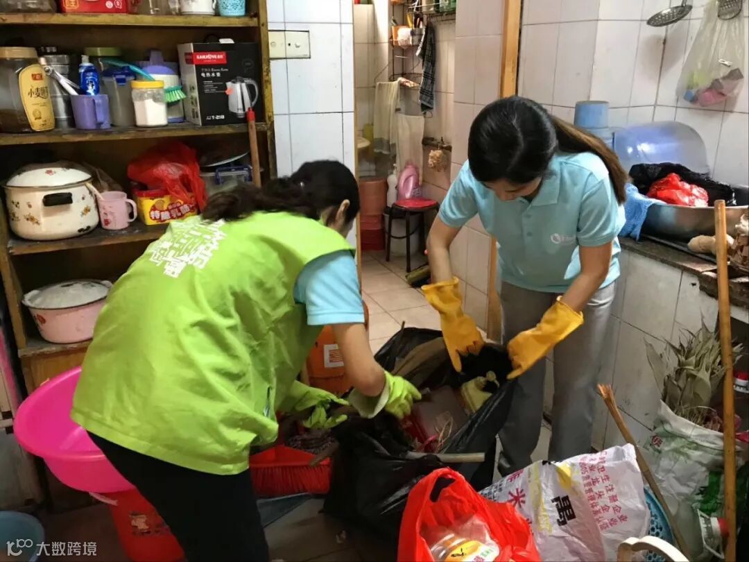 ➤义工队员跟陈婆婆谈心并帮忙收拾家中杂物