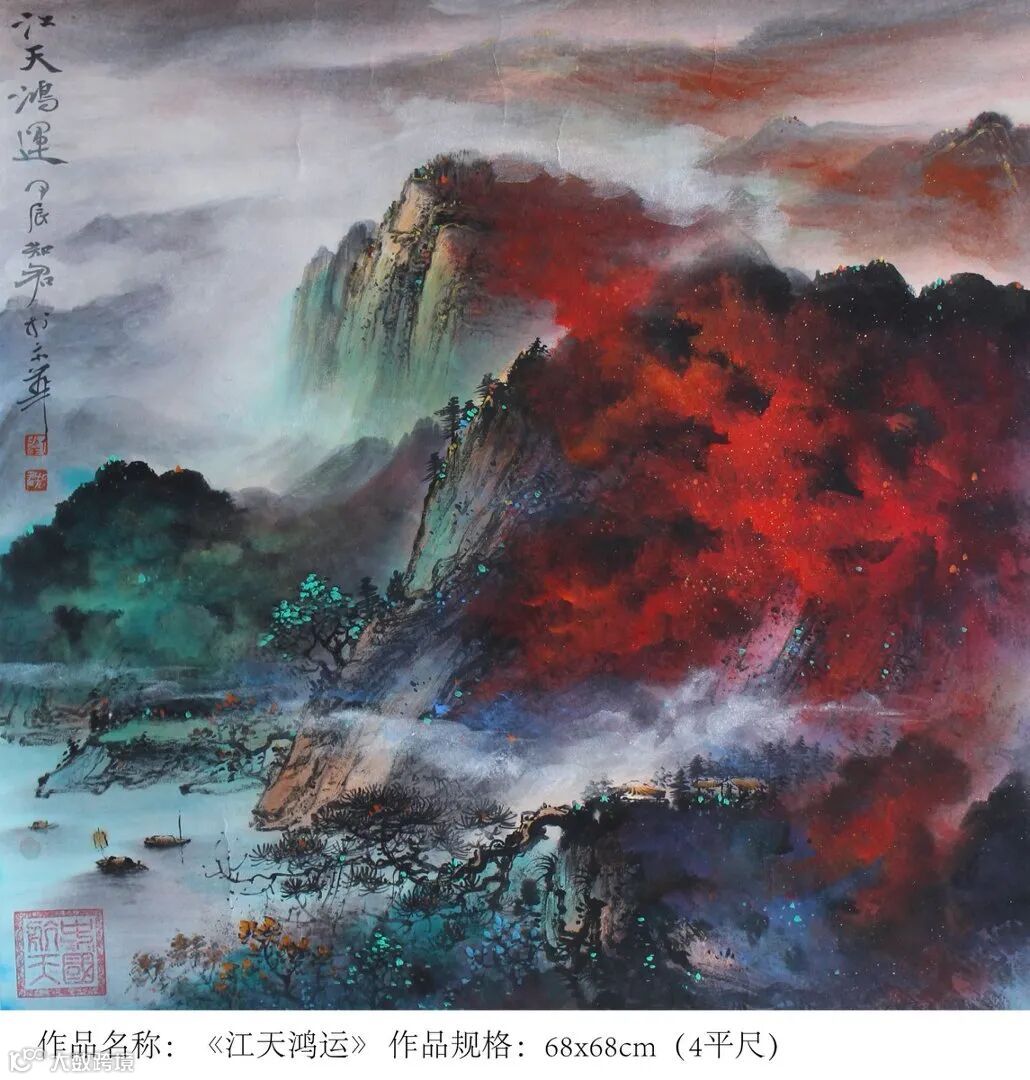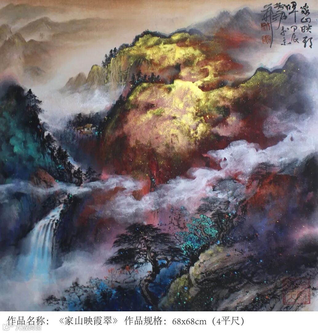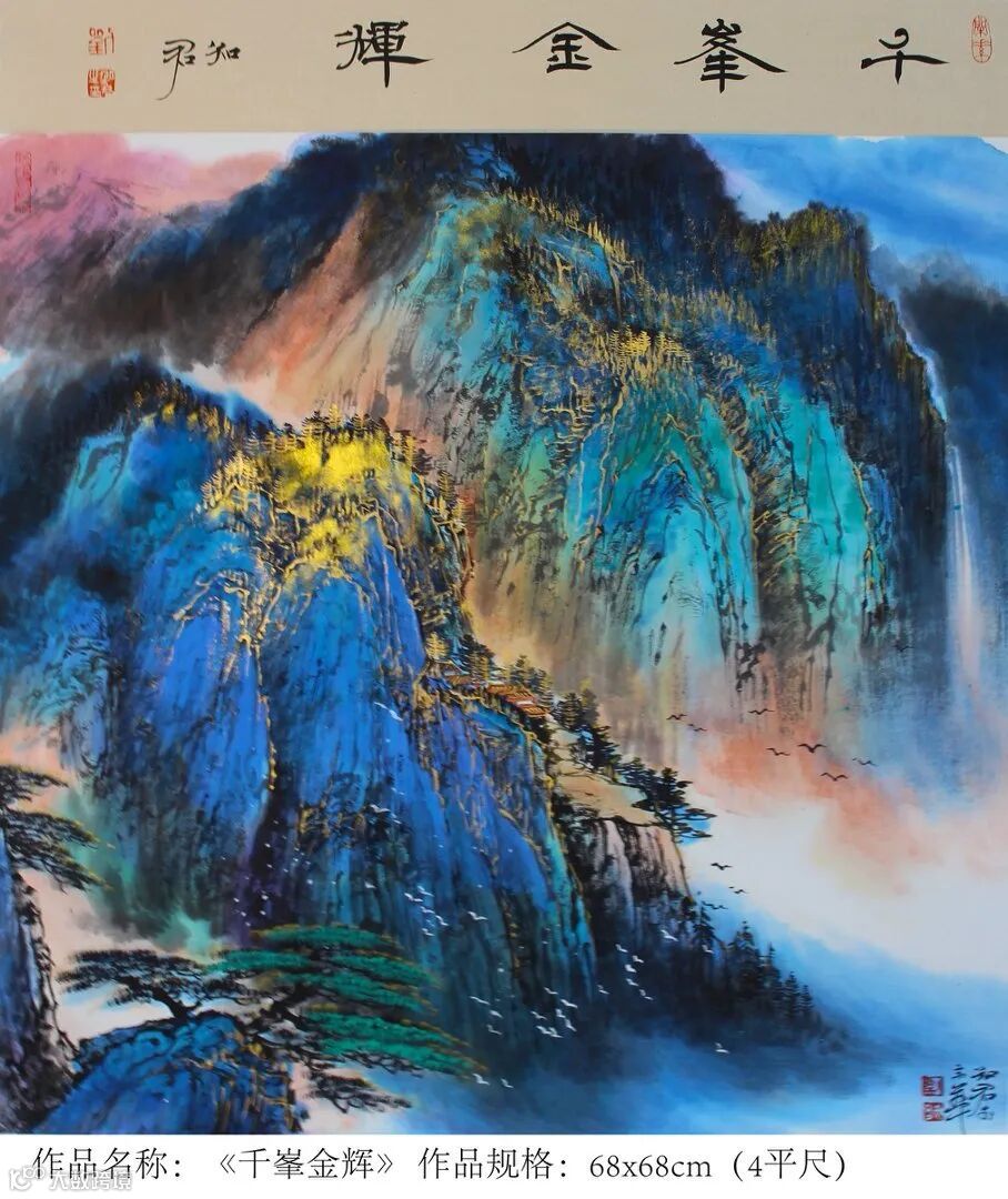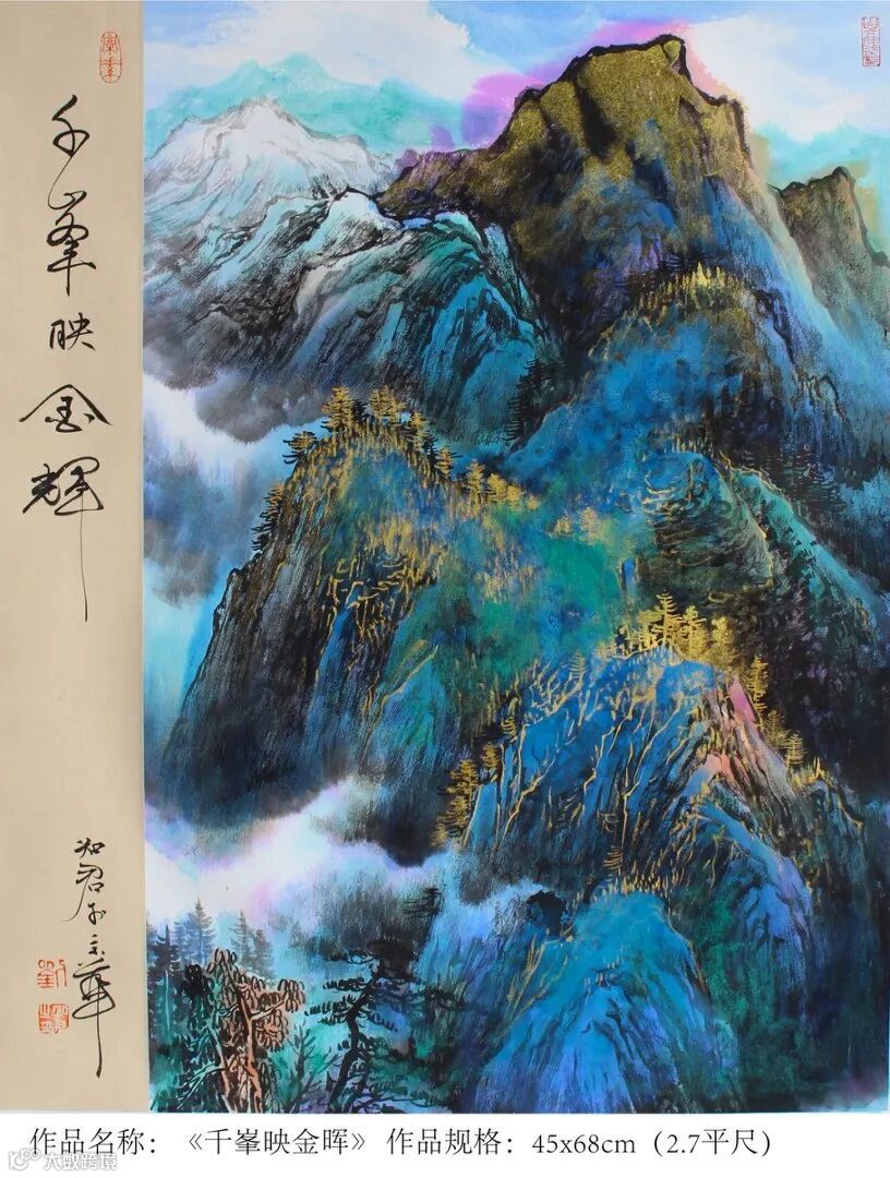 宗师气象在重墨山水上尤其明显。刘知君在传承传统泼彩金地山水的基础上,独创了当代泼金山水和仿古金顶山水,大气淋漓,富贵逼人,被国家国家博物院原副院长马英民评为“中华泼金绘画第一人”。