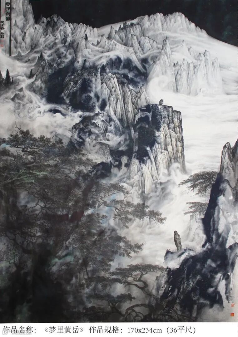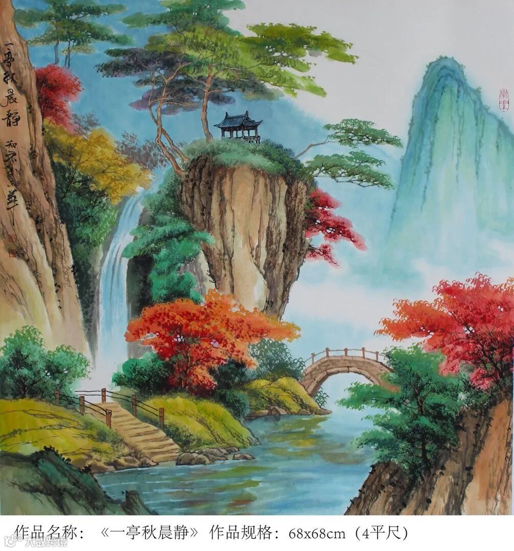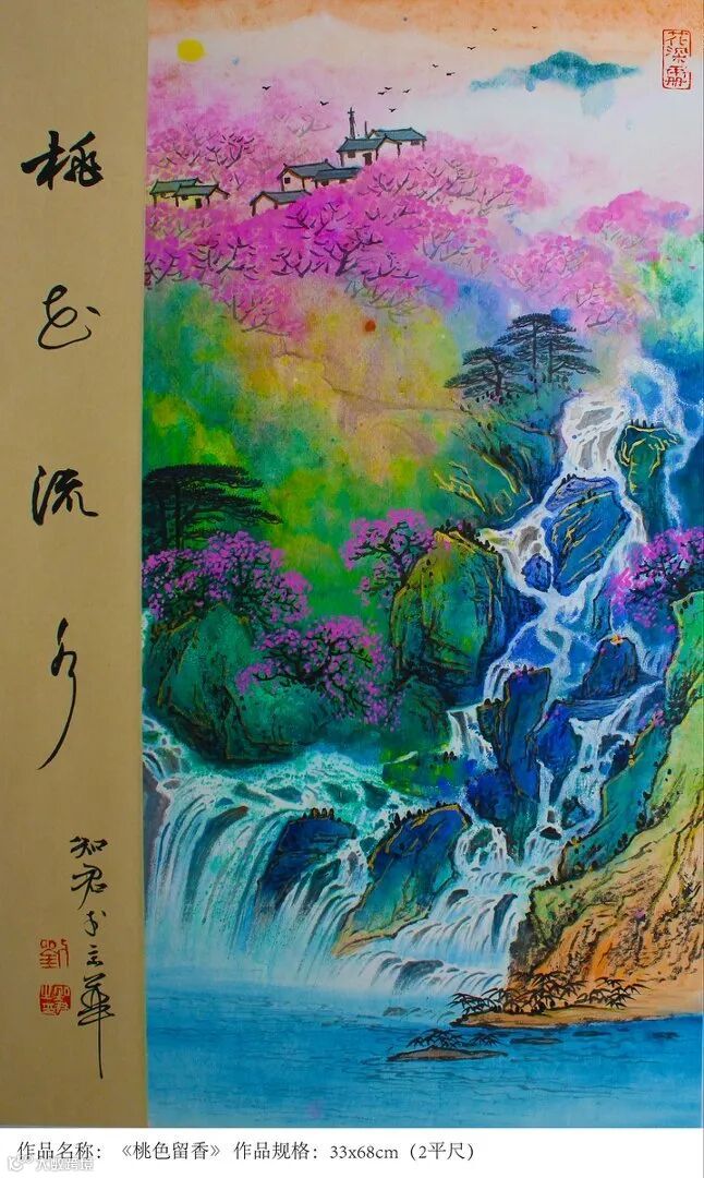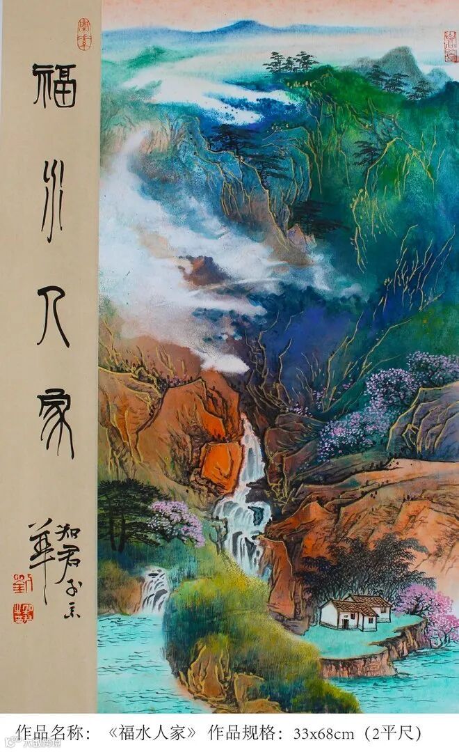宗师气象在重墨山水上尤其明显。刘知君在传承传统泼彩金地山水的基础上,独创了当代泼金山水和仿古金顶山水,大气淋漓,富贵逼人,被国家国家博物院原副院长马英民评为“中华泼金绘画第一人”。