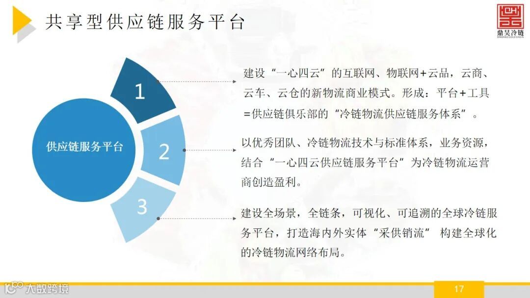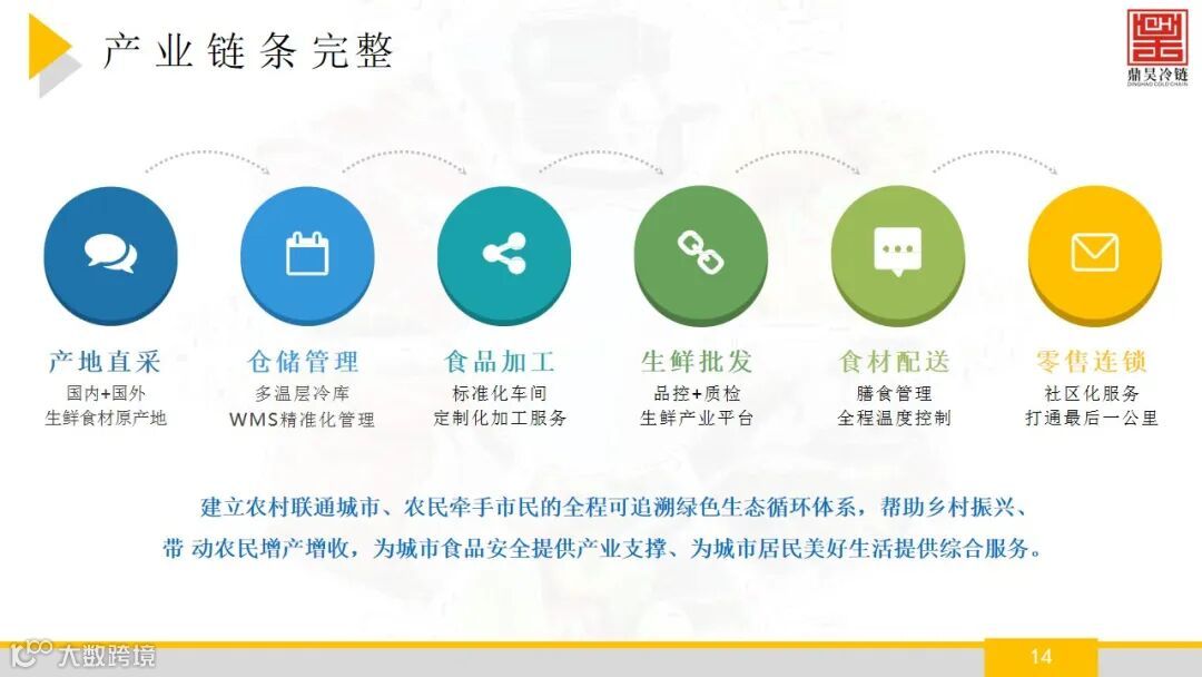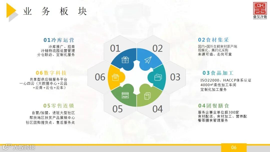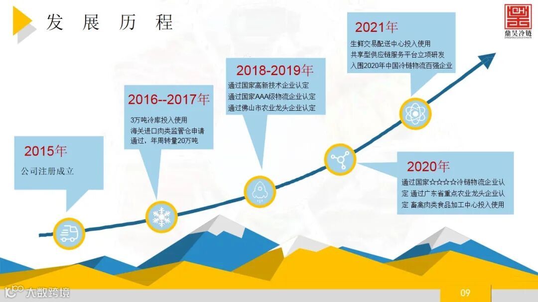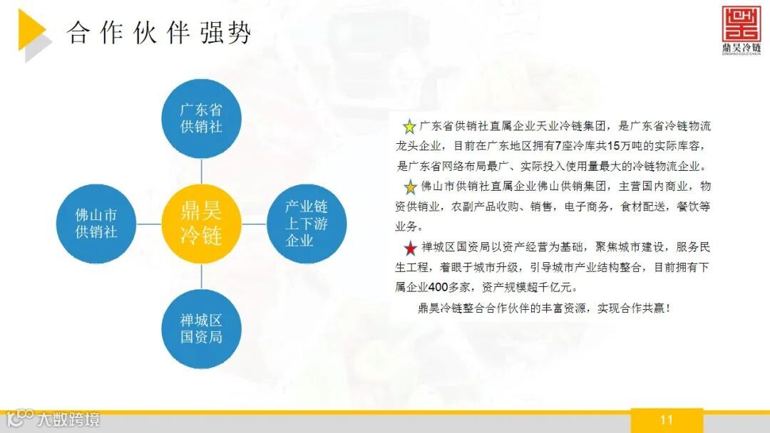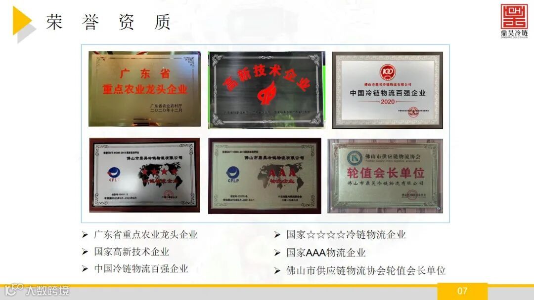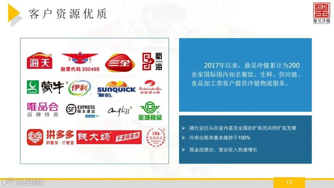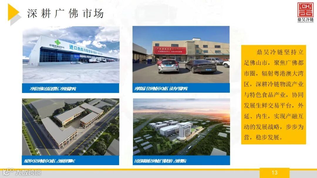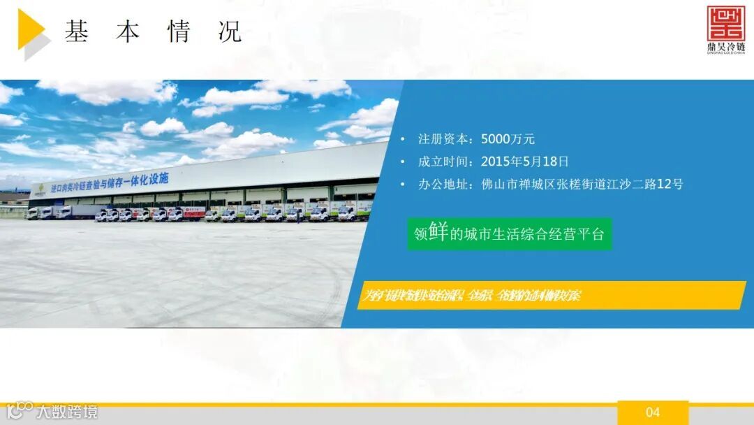 佛山市鼎昊冷链物流有限公司成立于2015年,注册资本:5000万元,鼎昊冷链旗下的鼎昊冷链物流产业园坐落于佛山市禅 城区张槎街道,鼎昊冷链物流产业园拥有禅城区唯一的大型冷链, 自有冷库库容超3万吨,具有较强的冷藏和低温配送能力, 配套设施完备,提供仓配一体化服务。并且经营着广州 海关在禅城区设立的进口肉类冷链查验与储存一体化设 施,年周转量超20万吨,具有明显的区位优势。