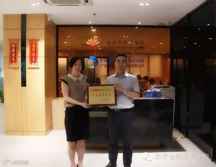 图为广东银泰金融服务有限公司曾总(左)接受佛山市外包协会秘书长赫泽林(右)匾牌