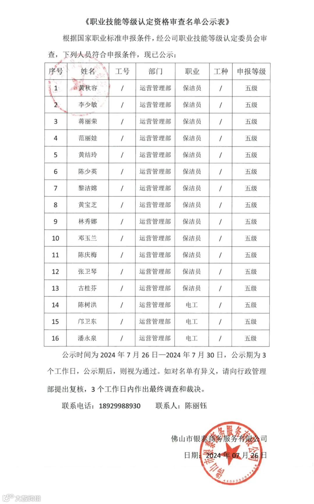关于佛山市银泰商务服务有限公司开展2024年8月职业技能等级认定资格审查名单的公示