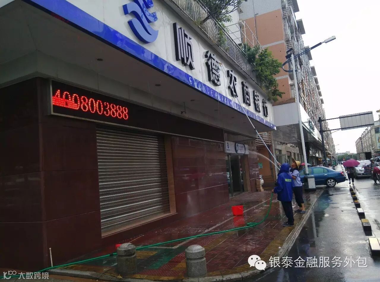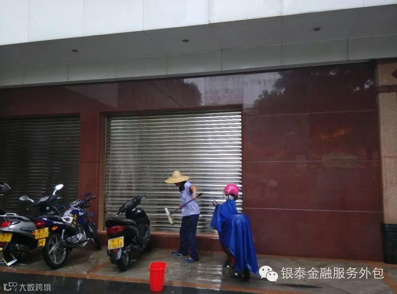 从银行外可以看到一位身穿着雨衣的队员手拿水枪对着银行招牌冲水,另一位队员衣服显然已经被雨打湿了,再换上工作服后再拿着清洁工具继续忙着清洗招牌。