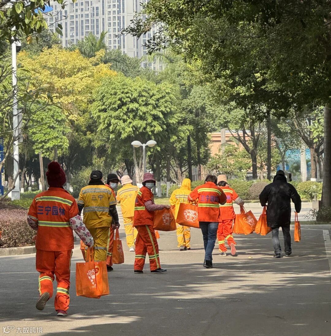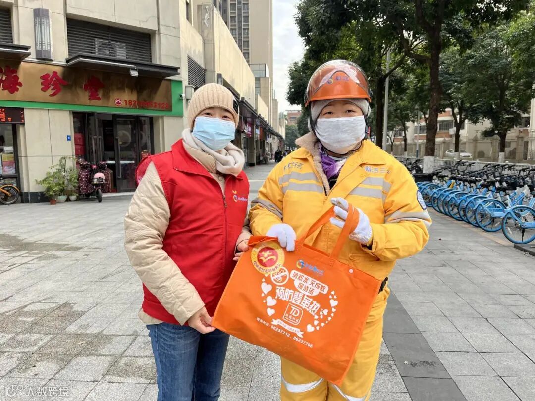 户外寒风凛冽,志愿者们却依旧热情高涨。大家耐心寻找着周边环卫工人的身影,为他们献上精心准备的暖心大礼包。
