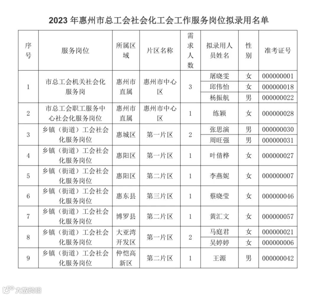 惠州市总工会社会化工会工作服务岗位拟录用名单公示
