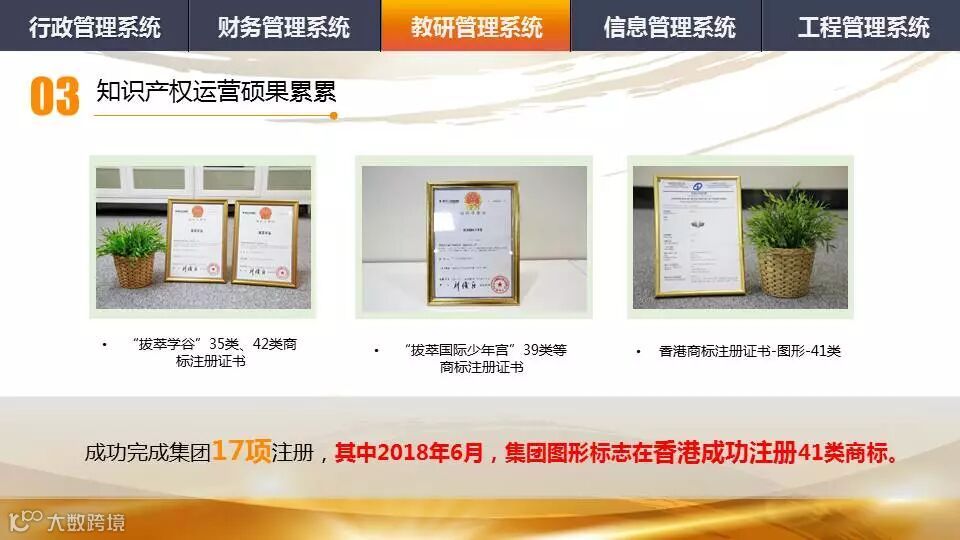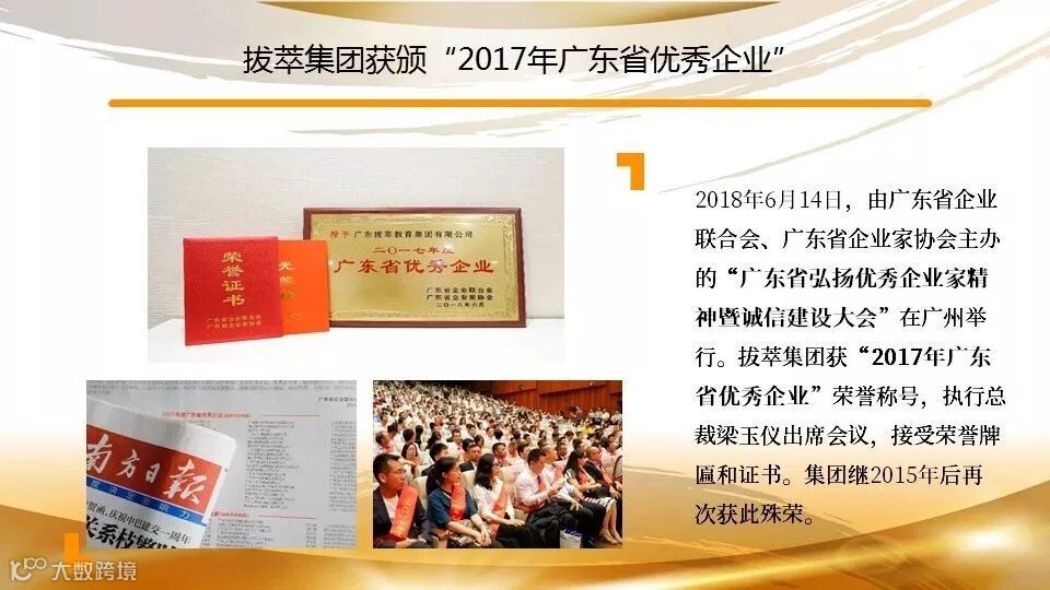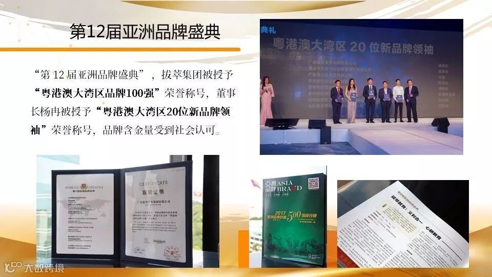 集团机关部门管理水平不断提高。各个子系统协同配合,高效运作,形成强大的合力,支撑并推动着旗下各个事业群(部)的发展。集团获“粤港澳大湾区品牌100强”、“2017年广东省优秀企业”等荣誉称号,拔萃品牌得到各界认可;成功注册17项商标,包括在香港成功注册图形标志;提升员工待遇,增强员工的幸福感和安全感。