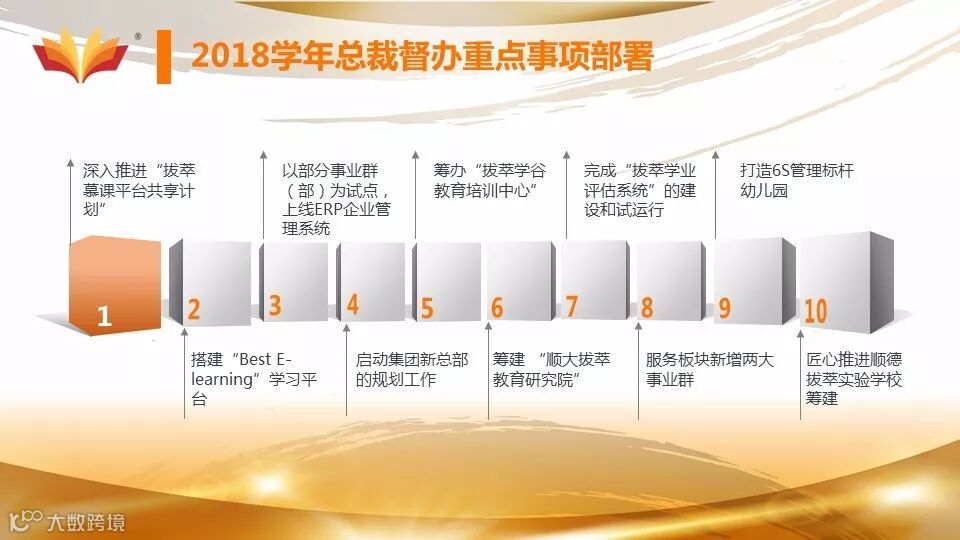 2017学年的成绩有目共睹,2018学年的应该如何突破?杨董围绕“聚人才、建系统、促科研”行动纲领,以及“拔萃系统、中西融合、在线教育”三大基石,对明年的工作计划作出了全面部署,提出了2018学年总裁督办的十个重点事项,包括继续推进“拔萃慕课平台共享计划”、搭建“Best E-learning”学习平台、上线ERP企业管理系统、启动拔萃集团新总部的规划工作、筹办“拔萃学谷教育培训中心”等。