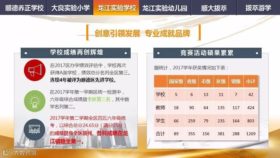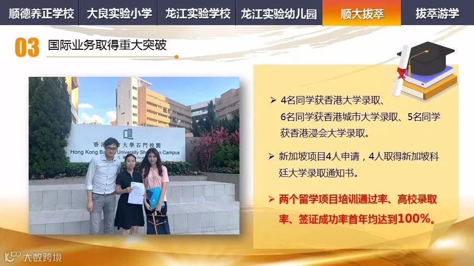 教育板块办学成果日益丰硕。各校教学质量稳步提升,课程建设硕果累累,拔萃师生走出顺德,走向世界,获得了大批奖项和荣誉。