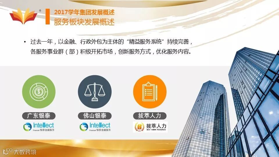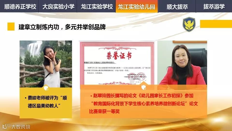 集团行政部、财务部、拔萃人力事业部、顺德养正学校、大良实验小学、龙江实验学校、中美拔萃龙江实验幼儿园、广东银泰事业群