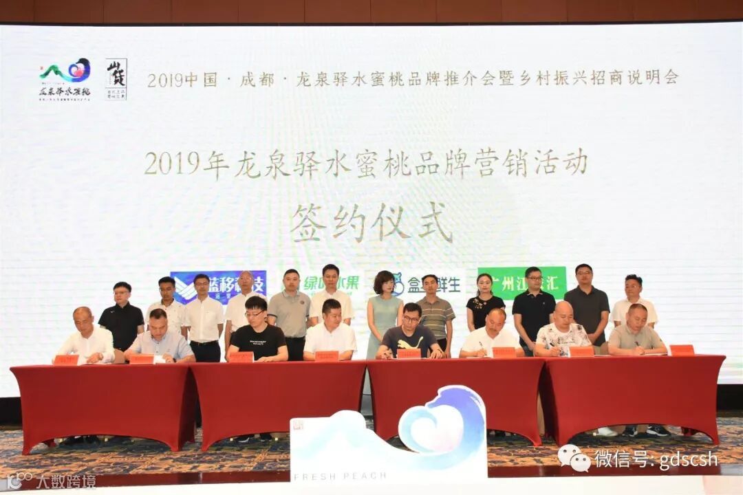 与会领导和嘉宾代表上台共同启动2019年龙泉驿水蜜桃品牌营销活动后,现场举行签约仪式,成都经开区(龙泉驿区)相关单位分别与天猫电商运营公司、盒马鲜生、长沙市绿叶农产品贸易有限公司、广州市江秾汇市场服务管理有限公司等企业成功签约。