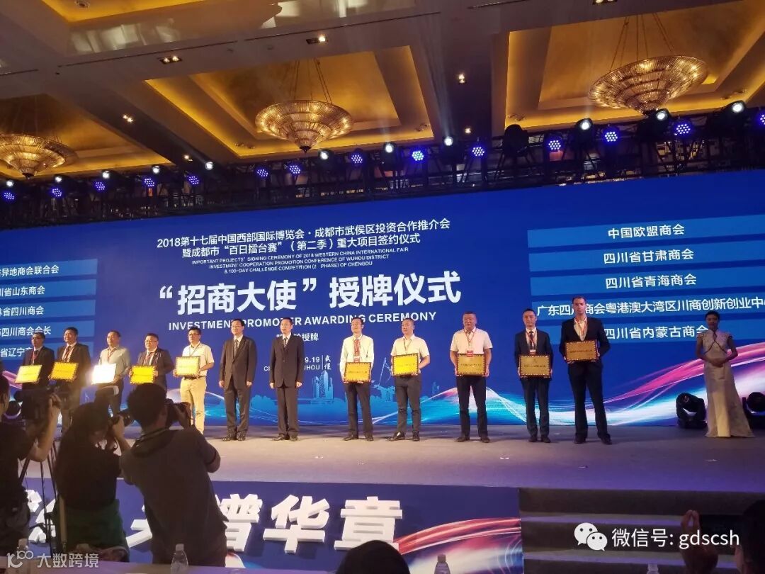 成都市武侯区投资合作推介会暨成都市“百日擂台赛”(第二暨)重大项目签约仪式上,为我会理事长朱曲波授牌“成都市武侯区招商大使”。