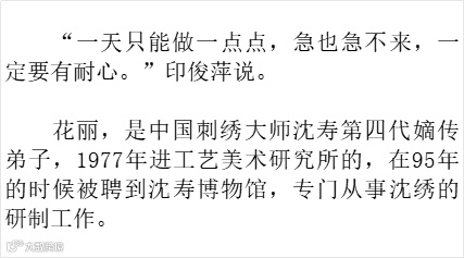 仿真绣是慢工活细,学的人很多,但真正能坚持下来的人却很少。周武珍已在海门中专授课5年,还在清澄书屋给中小学生免费培训,一直为仿真绣的传承不断奔走,让更多的人了解和喜欢仿真绣。