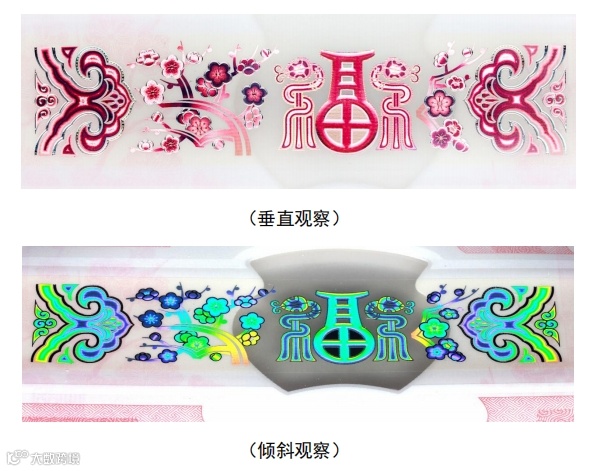位于票面下方。改变观察角度,票面正面可见“如意云纹”、 “梅花”与“福”字组成的装饰纹样呈现多色动感特征。防伪特征 效果见图6。