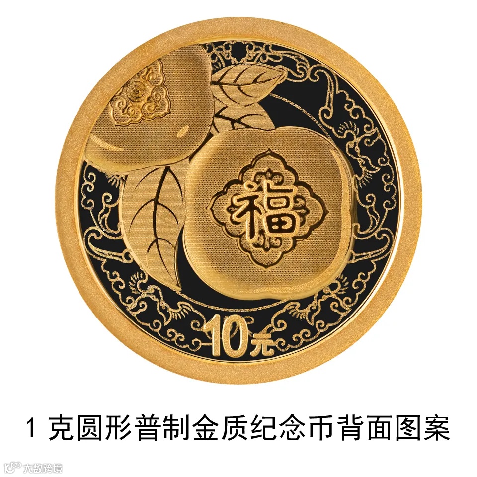 1克圆形金质纪念币背面图案为“福”字、柿子、蝠纹等组合设计,并刊面额。