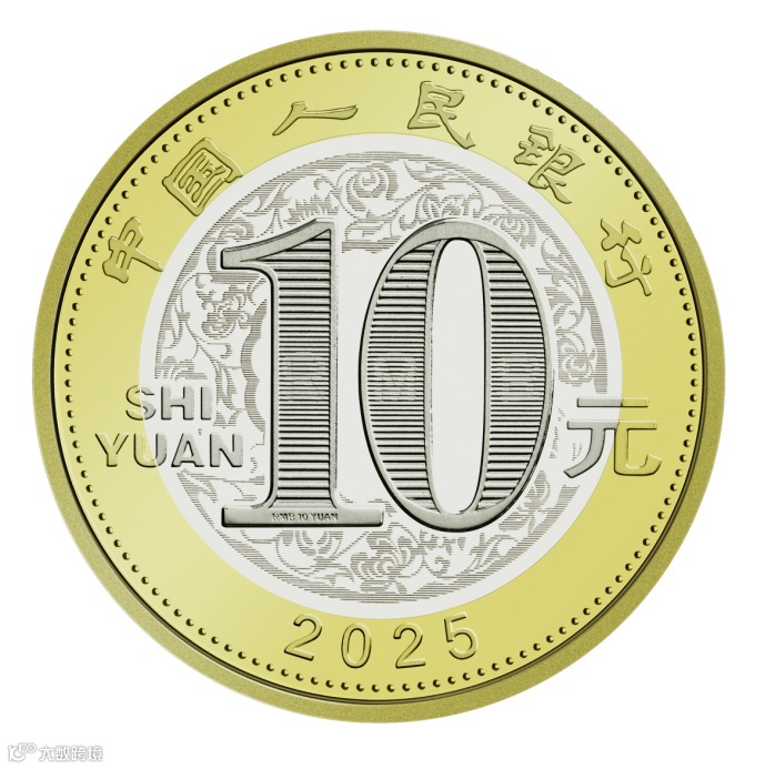 双色铜合金纪念币正面图案为“中国人民银行”、“10元”字样,汉语拼音字母“SHIYUAN”及年号“2025”,底纹衬以团花图案。