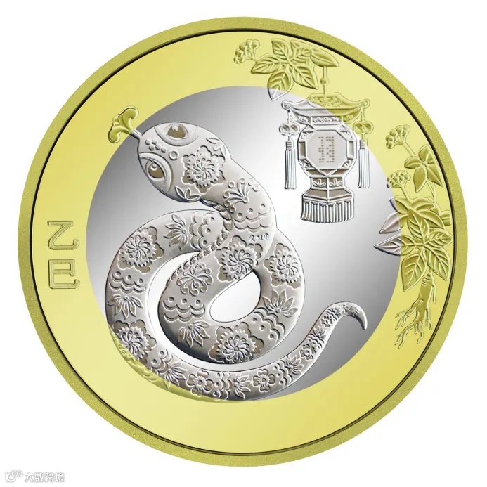 双色铜合金纪念币背面图案为中国传统剪纸艺术与装饰年画元素相结合的蛇形象,衬以花灯和人参图案,币面左侧刊“乙巳”字样。